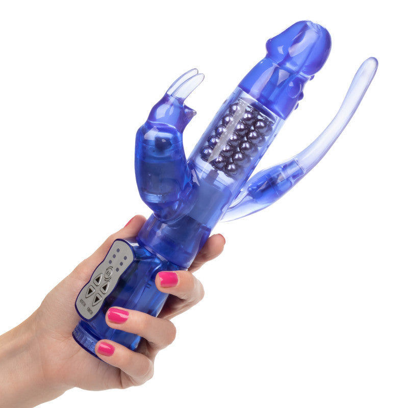 For the most daring pleasure seekers, the Delight Triple Orgasm vibrator was crafted to deliver thrilling stimulation from every erotic angle. The powerful rabbit has 3 powerful vibration motors to send spine-tingling stimulation throughout the sahft, rabbit teaser, and tail tickler. Indulge in a customizable pleasure experience with 3 intense vibration speeds and 3 rumbling shaft rotation speeds. Make a splash in the shower, hot tub, or bath with a sensationally powerful waterproof massager.