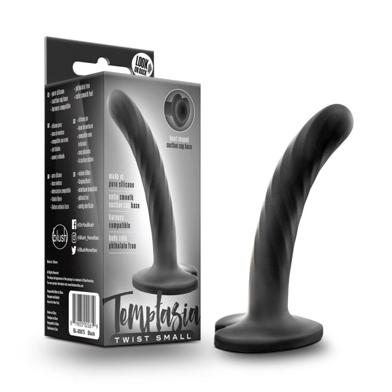 The Temptasia Twist Small delivers swirling texture that's perfect for gentle G-spot or anal stimulation! Its cute heart-shaped base includes a strong suction cup and is harness compatible. Either solo or with your partner, the Temptasia Twist is a fun, stylish addition to your playtime. The Twist Small's 0.75 inch width and 3.75 inch insertable length make it an excellent choice for the new dildo user, or for anyone who enjoys short, slim toys. With a satin smooth silicone finish, this dildo is made for comfort. Its 100% platinum cured silicone is body safe and easy to clean: just boil for 5 minutes to fully sanitize or wash with mild soap and water during everyday use.