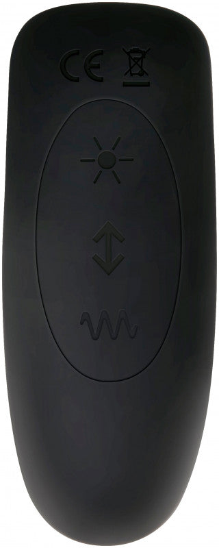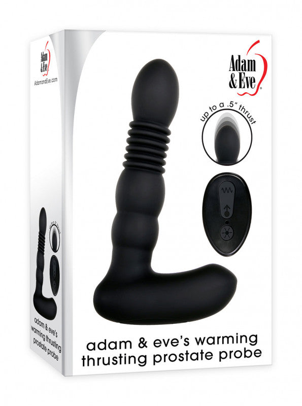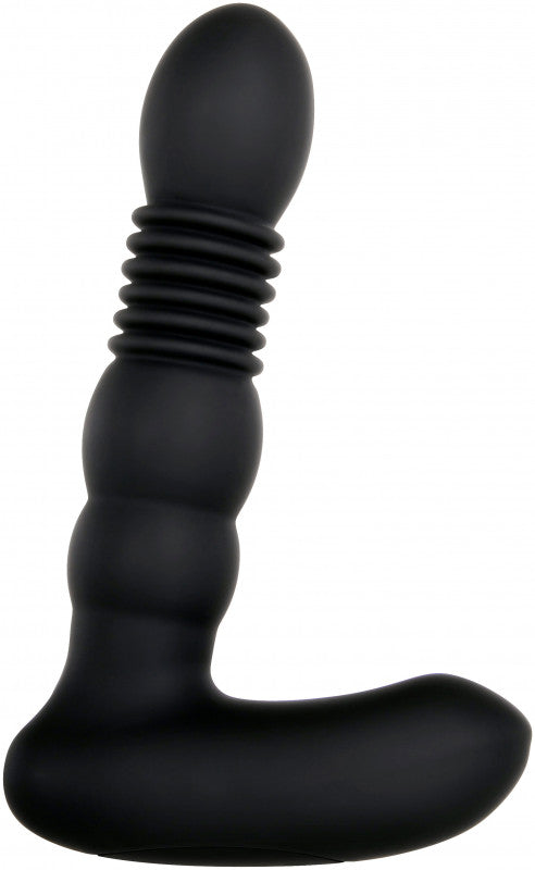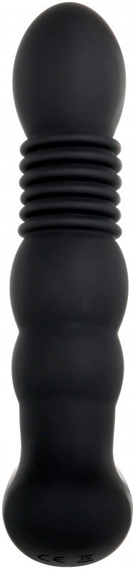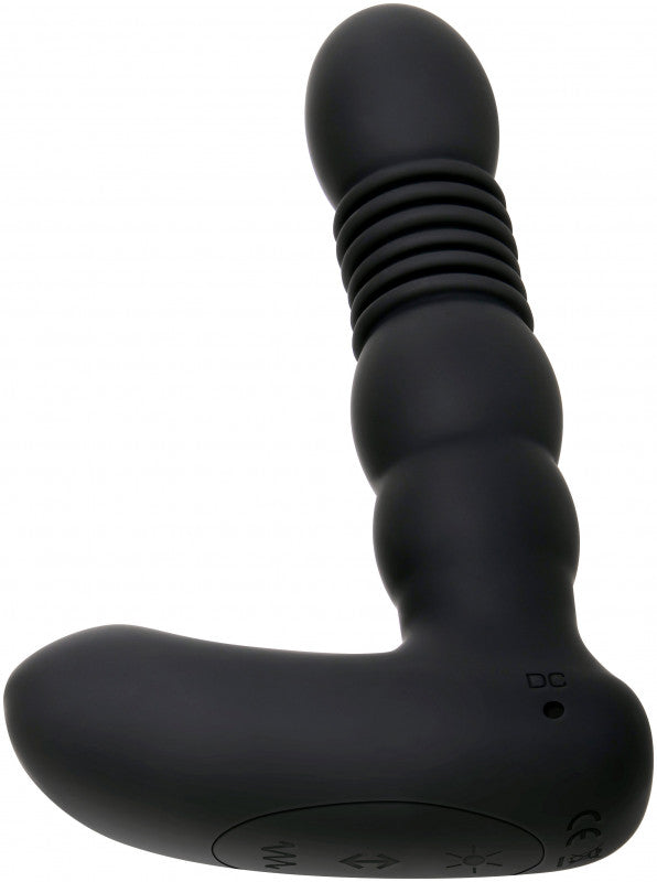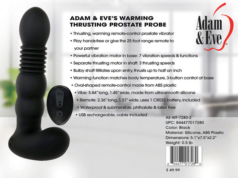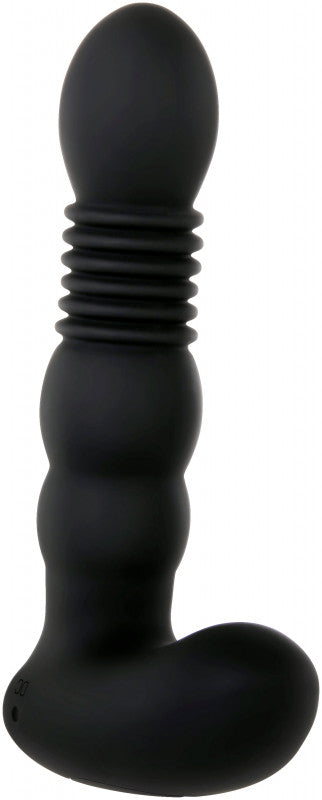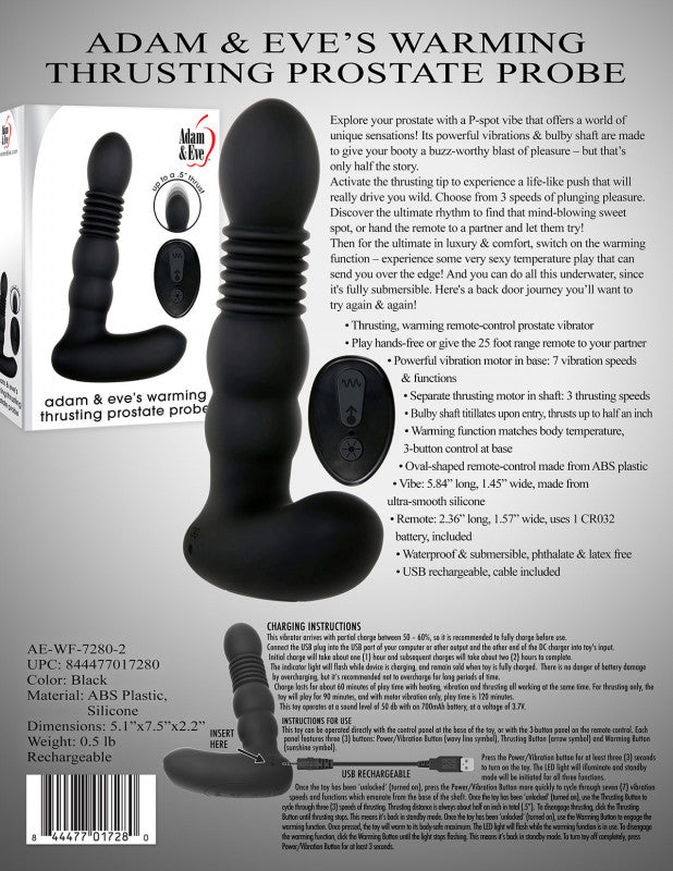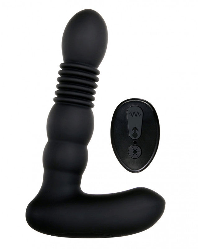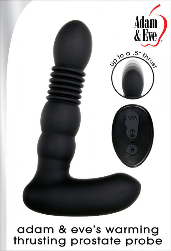 Thrusting, warming remote-control prostate vibrator Play hands-free or give the 25 foot range remote to your partner Powerful vibration motor in base: 7 vibration speeds & functions Bulby shaft titillates upo entry, thrusts up to half an inch Warming function matches body temperature, 3-button control at base Oval-shaped remote-control made from ABS plastic Vibe: 5.84" long, 1.45" wide, made from ultra-smooth silicone Remote: 2.36" long, 1.57: wide, uses 1 CR032 battery, included Waterproof & submersible, phthalate & latex free USB rechargeable, cable included