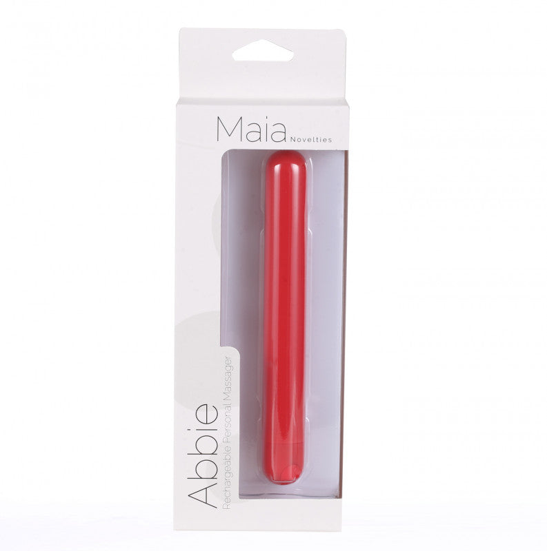 Experience waves of pleasure so intense, youll see Red, as in the Maia Novelties Abbie Red. This 10-Function Rechargeable Bullet Vibrator is coated with silky soft Silicone that is 100% body safe. The, bold and bright design conceals a bold and powerful motor. The long, slender shape allows for easy handling and multiple uses while the end position control button allows for easy speed change. The Abbie can also color your bath time Red with its 100% submersible design.