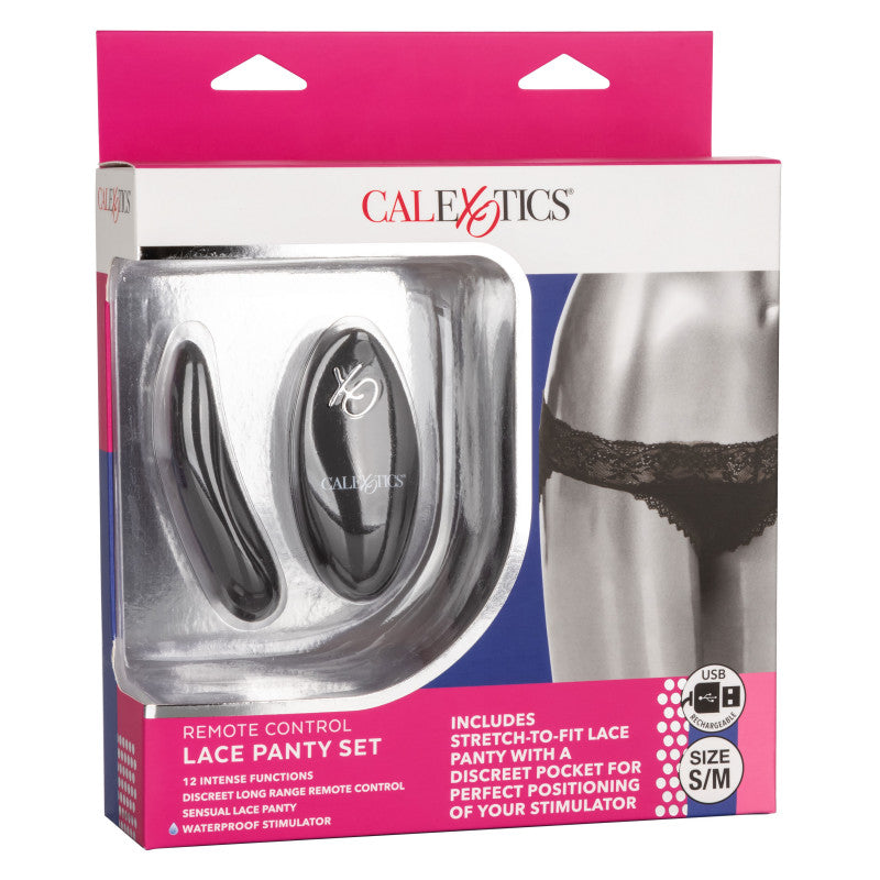 Indulge in your newest little secret with the Remote Control Panty Set. This sexy set includes a stretch-to-fit cheeky panty, curved panty teaser, and a discreet remote control with a range of up to 32' (10m). Whenever or wherever passion takes you, this passionate mini vibrator's 12 intense functions of vibration are ready for playtime. The sexy and stretchy lace panties feature a discreet internal pocket for the perfect stimulator pocket. Machine washable and oh-so comfortable, these vibrating panties are made for extended wear and adventurous playtime.