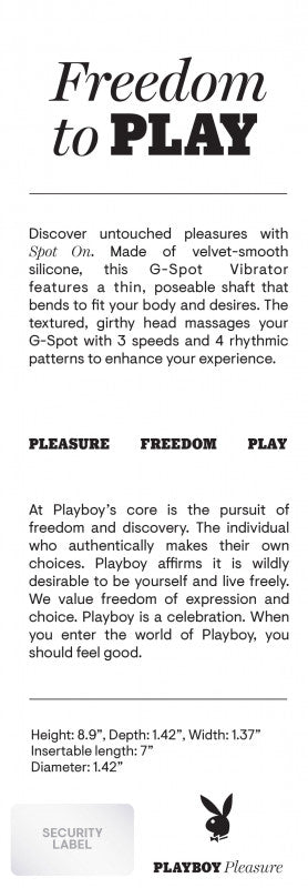 Discover untouched pleasure with Spot On. Made of velvet-smooth silicone, this G-Spot vibrator features a thin, posable shaft that bends to fit your body and desires. The textured, girthy head massages your G-Spot with 3 speeds and 4 rhythmic patterns to enhance your experience.
