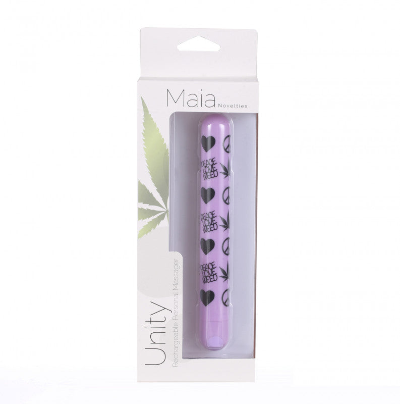 PEACE, LOVE and WEED. The Maia Novelties Unity makes a timeless statement with its modern design and nostalgic look. This 10-Function Rechargeable Bullet Vibrator is coated with silky soft Silicone that is 100% body safe. The PEACE, LOVE and WEED print design belies a soft yet powerful motor. The long, slender design allows for easy handling and multiple uses while the end position control button allows for easy speed change. The Unity can also be used for bath time highs with its 100% submersible design.